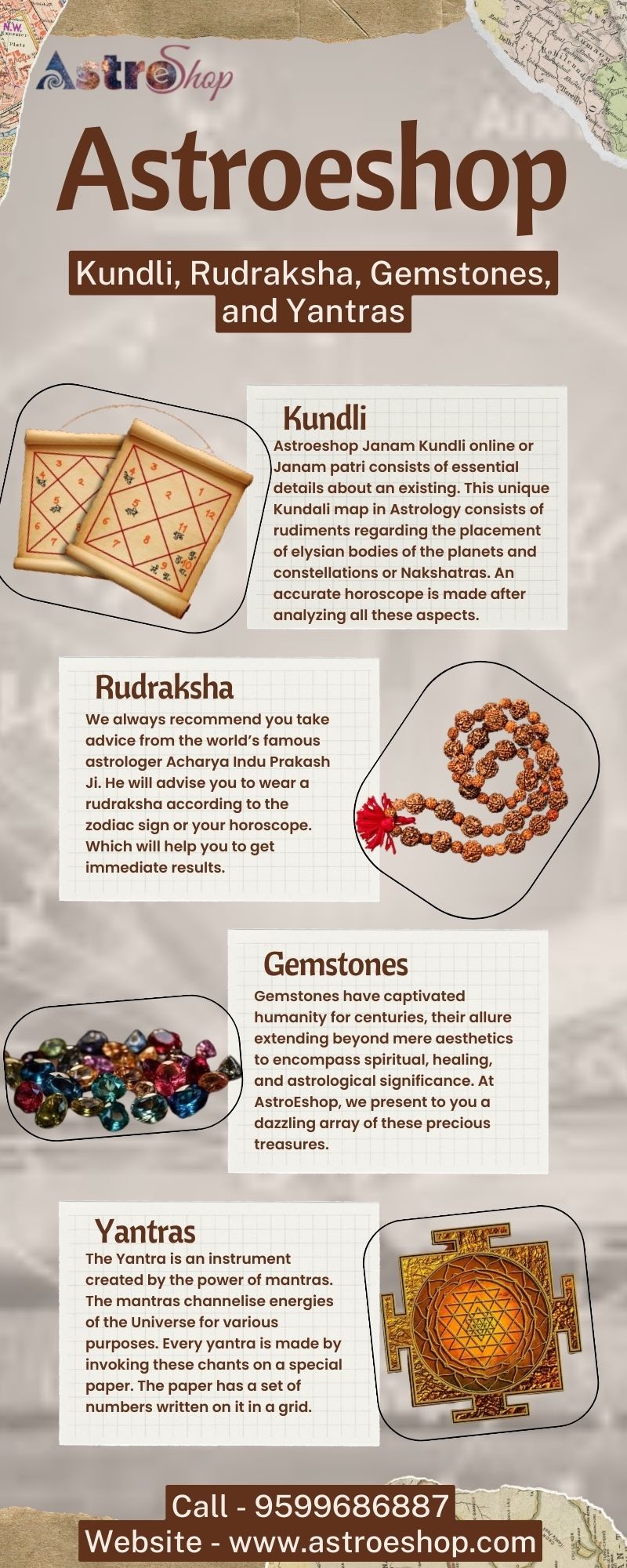Embark on a celestial journey with our services encompassing Astrology, Rudraksha beads, and personalized Janam Kundli online. Discover the profound impact of gemstones, align your energies with powerful yantras, and decode the cosmic roadmap of your life. For expert guidance and enlightenment, contact us at +91 9599686887. Your cosmic destiny awaits!