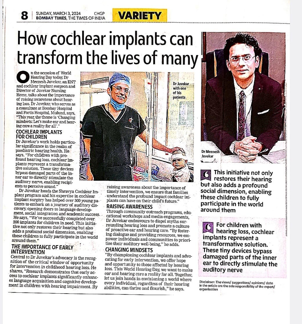 Enhance your hearing journey with Dr. Meenesh Juvekar, one of India’s leading cochlear implant specialists. With over 20 years of experience, Dr. Juvekar provides transformative cochlear implant surgeries for children and adults, ensuring personalized, compassionate care. Through partnerships with NGOs like the Tara Foundation, he extends essential support to underprivileged patients. Based in Mumbai, Dr. Juvekar’s state-of-the-art center serves patients nationwide, making world-class hearing restoration accessible to all. Trust Dr. Juvekar to help you or your loved ones rediscover the sounds
