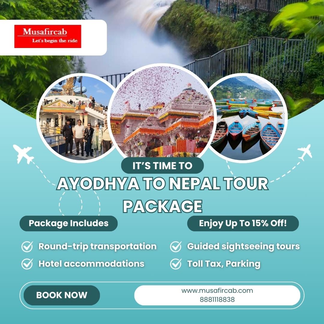 Plan your next #holiday with Musafircab and explore the divine connection between #Ayodhya, the birthplace of #LordRama, and Nepal, a land of cultural treasures and scenic beauty. Our Ayodhya to Nepal #TourPackages are designed to offer you a hassle-free journey packed with memorable experiences, spiritual enlightenment, and picturesque landscapes. Our packages include comfortable transportation,Accommodations in well-rated hotels, guided sightseeing tours, and all applicable taxes and tolls. Contact us at +91-8881118838.